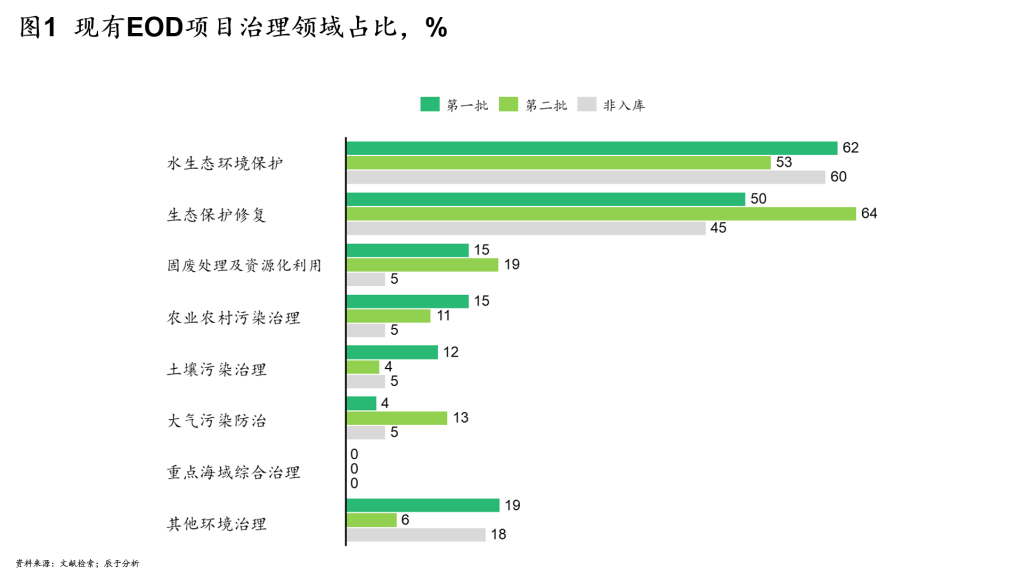 与第一批试点相比,第二批试点项目更重注生态保护修复等综合性质的项目,并重视清洁能源开发、固废资源化利用等进阶项目,这说明EOD项目的治理领域正在从单项走向综合,从防治走向资源利用。然而需要注意的是:非入库项目治理领域的综合程度较差,治理项目相对初级,有待加强项目规划,进一步提升项目质量。