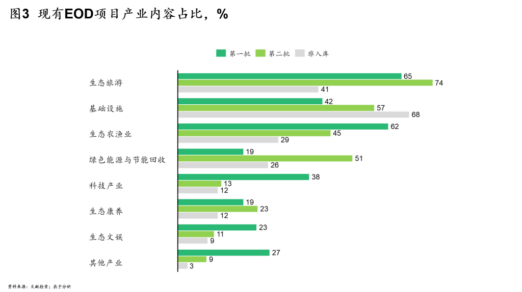 辰于统计现有EOD项目的产业开发情况后发现,文旅康养、生态农渔业以及各类基础设施建设在产业开发中的占比最高(见图3)。