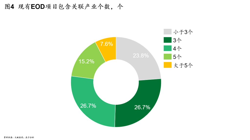 在关联产业数量上,我们发现:大部分EOD项目都包含多种产业,形成了一主多辅或多主互补的产业布局,从而提高项目的综合收益能力(见图4)。