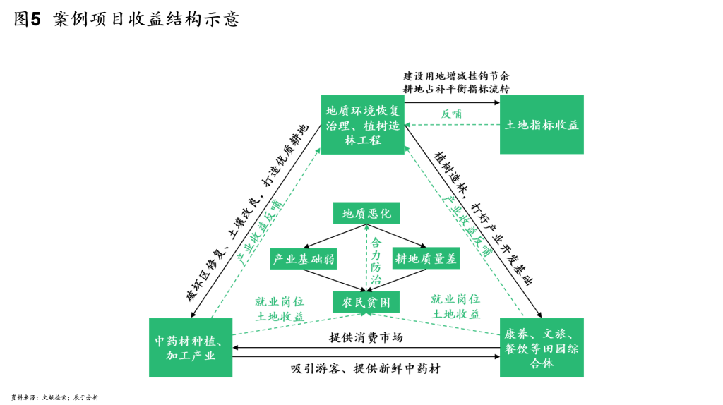项目通过地质环境恢复治理,改良当地土壤,打造优质耕地,不仅为中药材培育、种植、加工示范基地的建立创造了条件,还通过耕地占补平衡指标流转,实现了土地指标收益。进一步在蚂蚁山实施植树造林,为康养、文旅、餐饮等田园综合体的开发打下了坚实的产业基础,而这些产业给当地带来的收益又对环境治理进行了有效反哺。