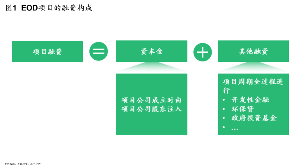 但从实际落地的项目来看,大部分EOD项目仍然是政府与社会资本合资成立项目公司,再由项目公司进行债权融资。因此,我们将EOD项目的融资结构分为两部分:一是在项目公司成立时由股东注入的资本金,二是在项目周期全过程内进行的其他融资(见图1),包括开发性金融、环保贷、政府投资基金等多种方式。