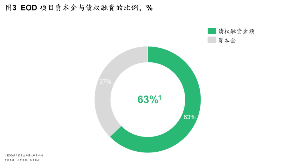 事实上,EOD的整体融资形式与PPP项目基本没有差别,从整体的比例来看,EOD项目资本金占整体投资的比例约3~4成,比PPP项目的平均比例要略高一些,而项目投资总额60%以上的资金均是通过债权融资解决(见图3)。