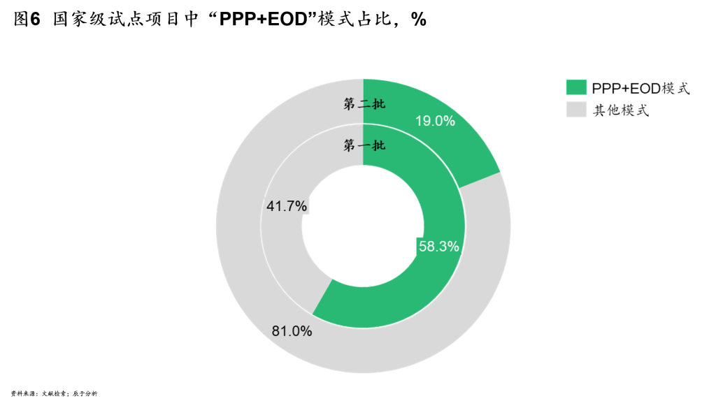 当EOD的理念应用到PPP项目中,就形成了独特的“PPP+EOD”模式,业内近年来对此有较多关注。在第一、二批国家级EOD试点项目中“PPP+EOD”模式占比分别达到58.3%、19%(见图6)。