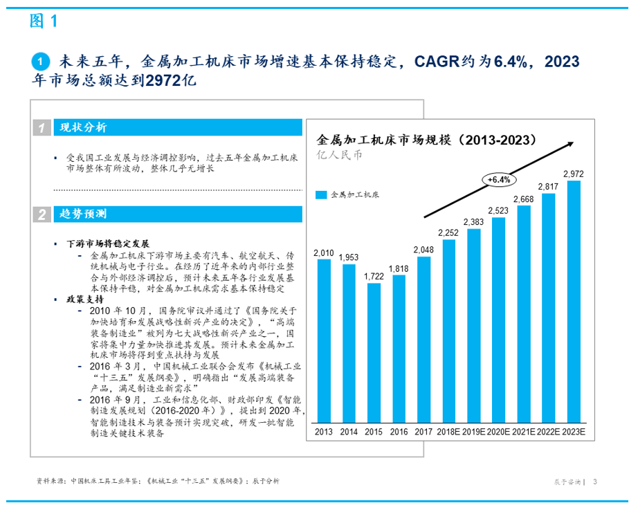 我们的研究显示,中国金属加工机床市场未来5年将以6.2%的CAGR持续增长,至2023年达到2972亿元。