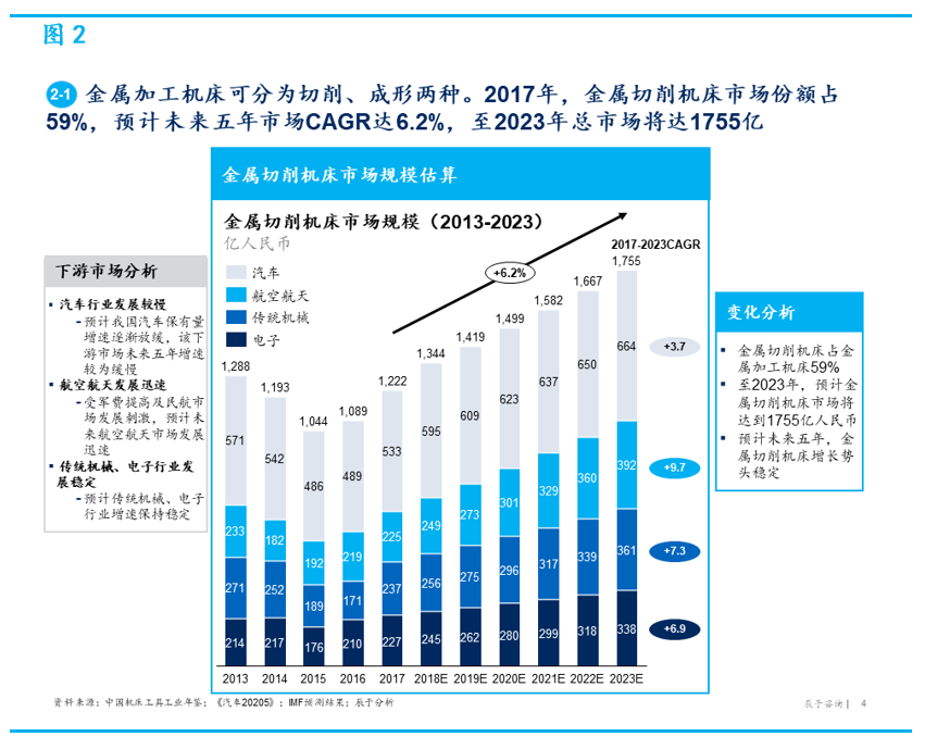 从产品维度出发,我们进一步对金属加工机床行业的发展趋势进行分析。金属加工机床行业可分为金属切削机床与金属成形机床。金属切削机床占金属加工机床市场59%,其主要下游市场为汽车、航空航天、传统机械与电子。预计未来五年各下游市场发展稳定,金属切削机床市场CAGR达6.2%,2023年增长至1755亿(见图2)。