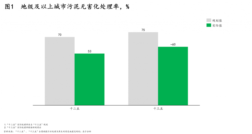 在此背景下,各级政府最终选择先将污泥处理放一放,将有限资金优先用于污水处理设施和管网建设,这导致国内“重水轻泥”的倾向明显,“十二五”和“十三五”规划中的地级及以上城市污泥无害化处理率目标两次落空也就见怪不怪了(见图1)。