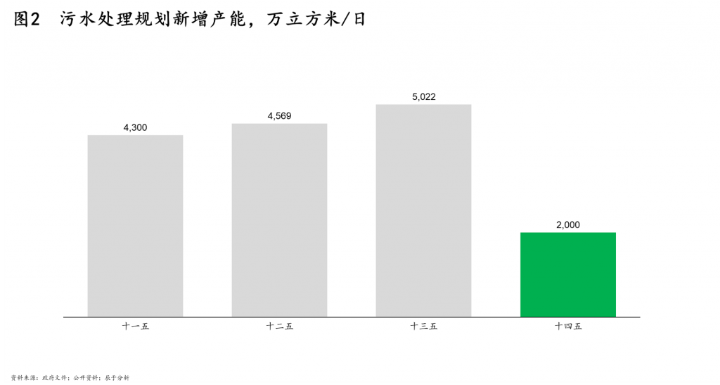 一是污水处理日渐成熟。近年我国城镇污水处理任务已基本完成,城市污水处理率已经达到95%以上,在“十四五”规划中的污水处理新增产能也出现明显下降(见图2)。在污水处理渐趋饱和的情况下,先前遭到忽视的污泥处理问题重新得到关注。