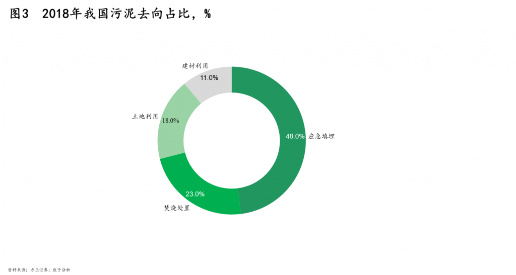 在这样的条件下,大部分地区对污泥处理以最便利的填埋为主。以2018年为例,我国污泥去向近半成为应急填埋(见图3),尽管填埋并非最合适的污泥处理方式:占用土地面积大,场地不宜寻找;往往治标不治本,因污泥含有重金属及病菌,遇水极易造成二次污染,包括有害成分渗漏造成地下水污染、污泥中的营养物质使大量病原菌滋生繁衍等。
