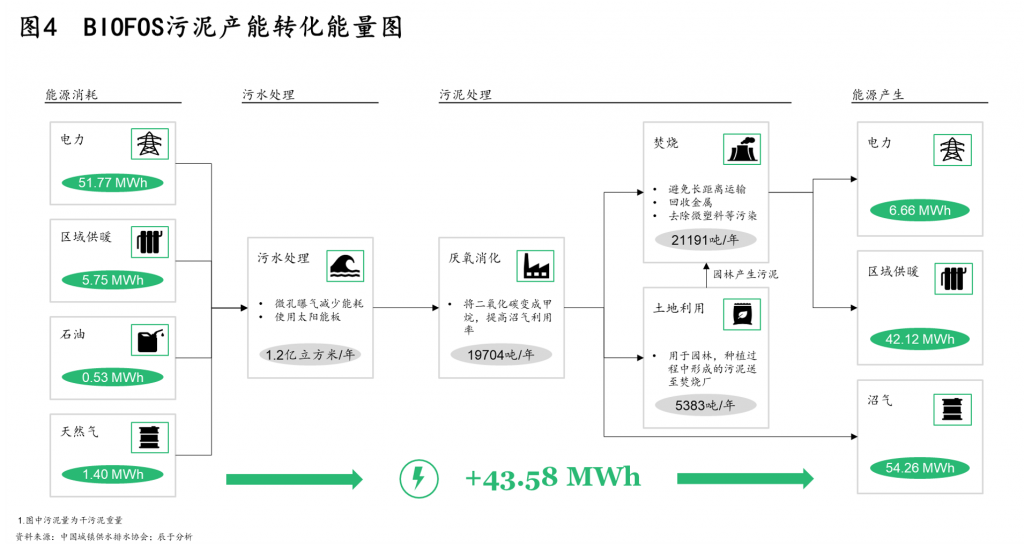 其二,30·60双碳目标提出后,未来污泥处理处置将以节能降耗及能源资源回收为目标,这对污泥处理提出了更为清晰的技术路径方向。例如在能源回收上,厌氧消化是优选途径,如丹麦污水厂BIOFOS通过污泥消化产能实现能量盈余(见图4)。
