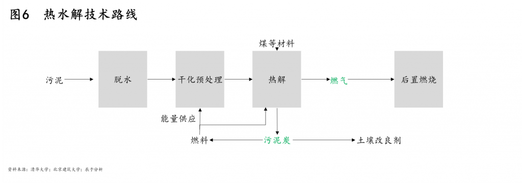 而在资源回收上,相比好氧堆肥,干化焚烧及热水解则是更好的资源化方式,值得重点关注。干化焚烧的技术路线如图5所示,作为最快捷、最彻底实现污泥减量化、稳定化、无害化的最终处置技术,干化焚烧后的资源化利用产品也更易走通;热水解的技术路线如图6所示,其生产过程清洁化,生成的污泥炭资源多样化。