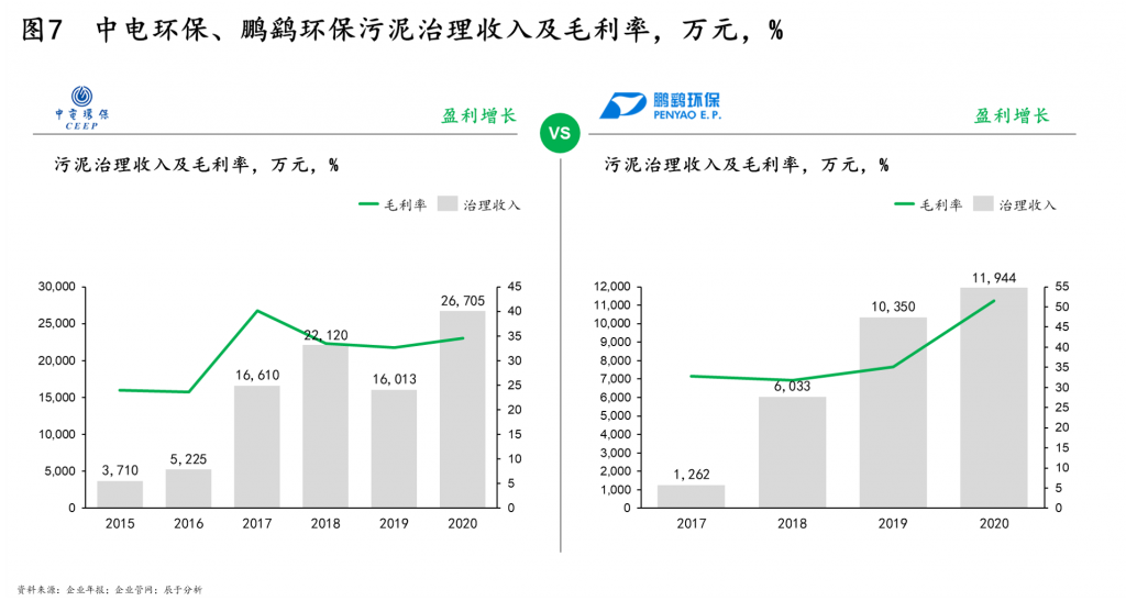 即便如此,我们也看到了部分盈利表现优良的企业,如中电环保和鹏鹞环保,两者的污泥处理营收和毛利率在近年来均呈现不同程度的增长(见图7)。