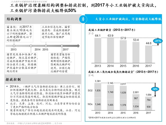 与此同时,中国大气治理在全国空气质量改善、能源结构和产业结构调整、清洁高效火电体系建设、工业锅炉治理、散煤治理、VOCs治理、机动车污染治理以及法制保障和经济政策建设等8个方面都取得了良好的成效或重大突破。以工业锅炉治理为例,通过结构调整和排放控制兼顾的治理措施,出台了多个工业锅炉管理政策,工业锅炉排放标准步步趋严,使得大量工业小锅炉被淘汰,工业锅炉污染物排放总量降低50%以上(见图4)。