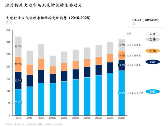 火电超低改造将于2019年年底基本完成。我国在能源结构调整过程中,火电产能几乎不再增加,2019年后火电大气治理市场主要来自运营与维修。在此假设下,预计火电大气治理市场2019年下滑趋势将继续,2020年以后有所反弹,2019-2025年保持4.1%的年复合增长率,2025年市场规模超过300亿,其中第三方运营市场是火电治理市场未来增长主要动力(见图6)。