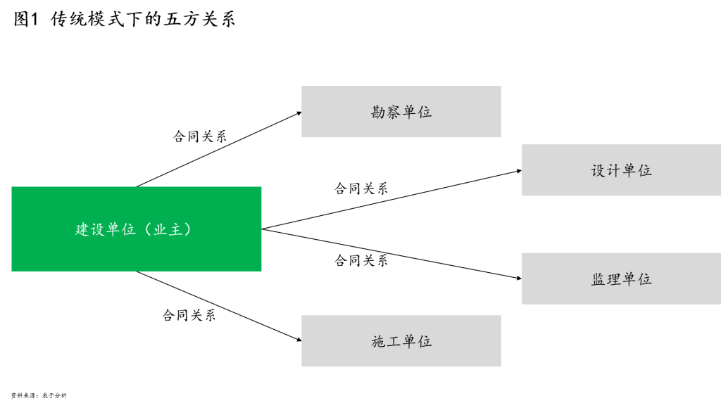 在传统的工程管理模式下,业主方需要与各类工程咨询机构以及施工方打交道,包括但不限于设计单位、勘察单位、监理单位、造价单位等,基本上形成了五方关系(见图1)甚至更多方关系。
