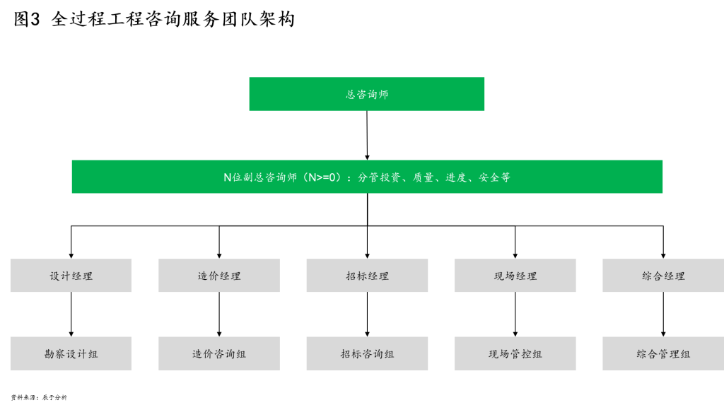 但全过程工程咨询的服务团队要复杂不少:首先,分条线(或服务内容)组成专业的团队,比如设计团队、监理团队、造价团队等,然后,需要有一个项目总负责人来统筹整个大团队,形成一个三层或四层的团队架构(见图3)。