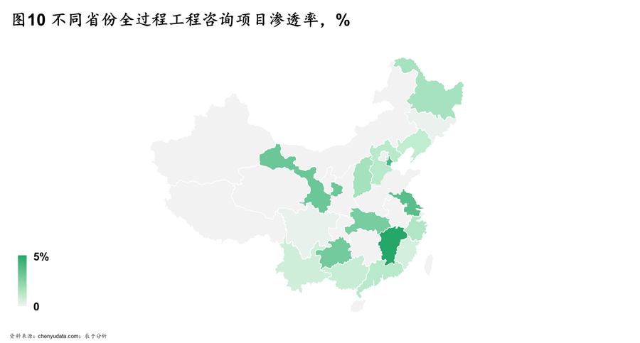 其中试点较早的省份、基建需求大的省份渗透率更高(如图10),发展更快。广东等沿海一带省份较早就加入了全过程工程咨询的试点范围,积累了比较多的经验,全过程工程咨询模式应用更为成熟;甘肃、云南等省份工程建设需求多,更有动力采用全过程工程咨询的模式来进行工程建设。