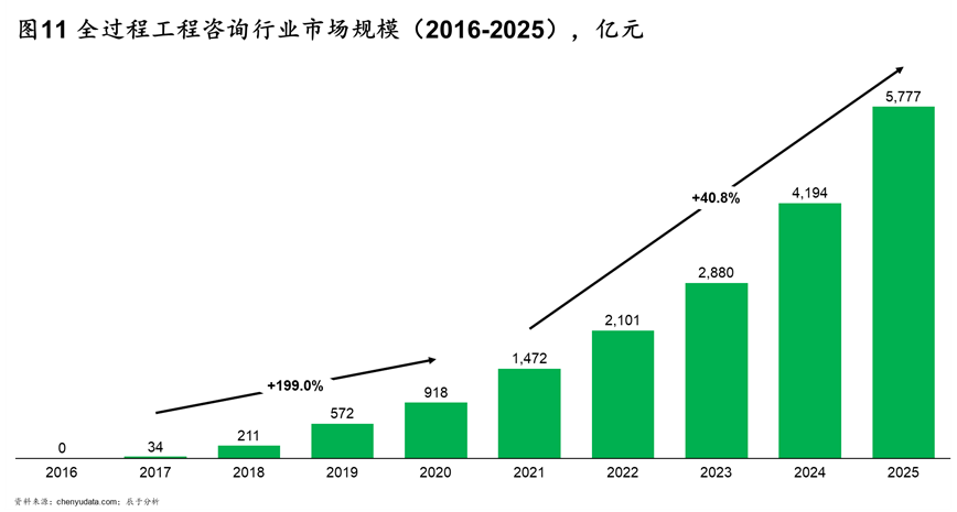 除政策之外,在技术、市场等有力因素加持下,全过程工程咨询市场规模增长将全力提速。假设到2025年全过程工程咨询对整个工程咨询行业的渗透率达到10%,且工程咨询行业整体规模将保持平稳增长,我们预计全过程工程咨询市场规模将在2025年达到5777亿元,期间年复合增长率为40.8%(见图11)。全过程工程咨询作为行业未来发展的方向,十四五期间将迎来黄金发展期,行业内企业应抓住机遇大力发展。