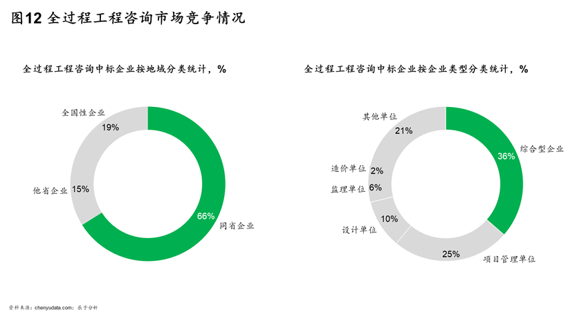 目前全过程工程咨询市场竞争还处于无序(如图12)的状态,一是当地企业具有较强的地域优势,从企业地域上看,同省企业最容易获得青睐,全国性企业次之,外省企业获取项目难度最高,近年全过程工程咨询项目中有高达66%的项目被当地同省企业获得。