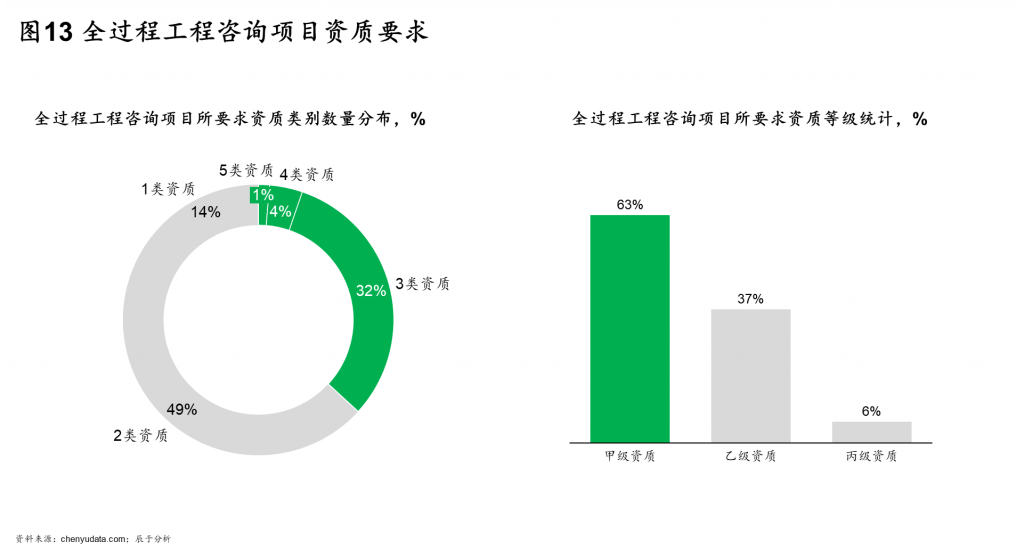 全过程工程咨询项目的资质要求高,无论是在资质广度和资质等级上均提出了较高的要求(见图13)。在资质广度上,全过程工程咨询项目共涉及6类资质,大部分项目都需要2类及以上资质,其中一半项目需要2类资质,三成项目需要3类资质,要求企业具备一定的综合实力。全过程工程咨询资质分为三个等级,从低到高分别为:甲级、乙级和丙级。全过程工程咨询项目对所需资质的等级要求大部分为甲级和乙级,丙级资质价值非常有限,对企业专业水准有较高考验。