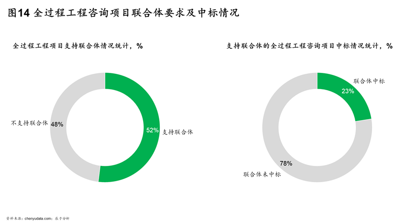 资质不足的企业有两大解决方案,一是与满足资质要求的企业组成联合体,但这种方案的效果并不理想。由于独立的投标方对于建设方来说更加容易管理,48%的项目都明确要求不支持联合体投标;即使支持,联合体在竞争中也不占据优势,在支持联合体投标的项目中,仅有23%的项目由联合体中标。