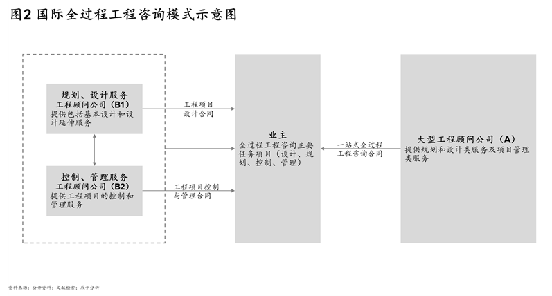 其二,在“一带一路走出去”的过程中,国内建设行业需要与国际进行接轨。在“一带一路”的大背景下,中国建筑商以“中国速度、中国管理”享誉全球,但中国的工程咨询企业在国际上影响力依然较低。为向国际惯例接轨,提升工程咨询企业的综合服务能力和核心竞争力,培育一批具有国际水平的全过程工程咨询企业成为必然选择。 国际上全过程工程咨询已经成为工程建设的“标配”,主要有A、B两种模式(如图2)。A模式以美国为代表,由大型工程顾问公司与业主签订一站式全过程工程咨询合同。B模式则以德国为代表,由工程顾问公司分别提供规划设计服务(B1)与控制管理(B2)服务。