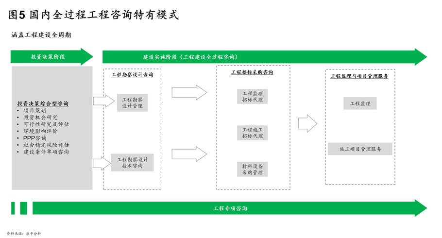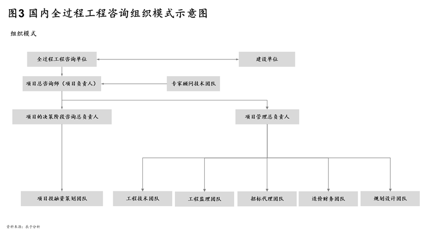 在这种完整性不足、整体性不强的行业背景下,国内全过程工程咨询形成了三类特有模式(如图5)。