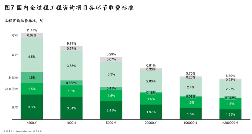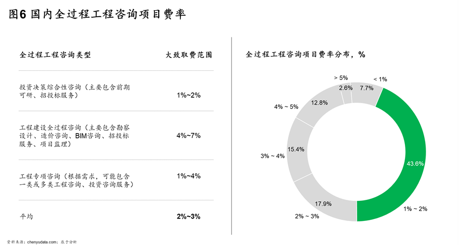 在这三类模式下,大量全过程工程咨询项目仅仅包含两到三类咨询服务,因此项目的平均取费标准较低,仅能达到2%左右(如图6)。