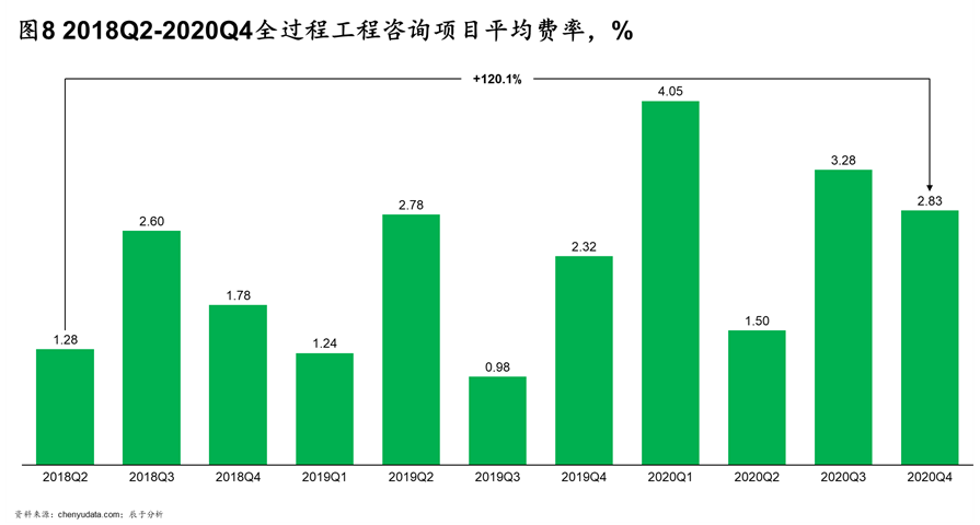 但随着全过程工程咨询越来越明晰,全过程工程咨询所包含的咨询服务综合性越来越强,取费标准低将逐渐提高,目前已有上升趋势(如图8)。
