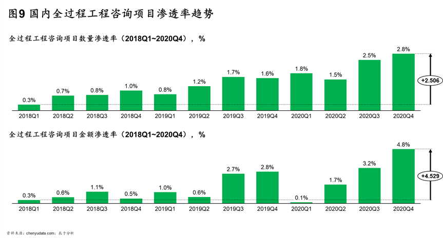 近年来,住房和城乡建设部等政府部门大力推动全过程工程咨询发展,以提升我国工程咨询水平与国际接轨,例如2019年明确规定政府投资项目都应采用全过程工程咨询模式。同时在各类协会、企业的共同参与下,全过程工程咨询相关的技术标准、合同模板等快速成型,为市场发力做好准备。 在政策强力驱动下,全过程工程咨询行业项目数量与项目金额的渗透率近三年均迅速提升(如图9),分别由0.3%、0.3%达到2.8%、4.8%。
