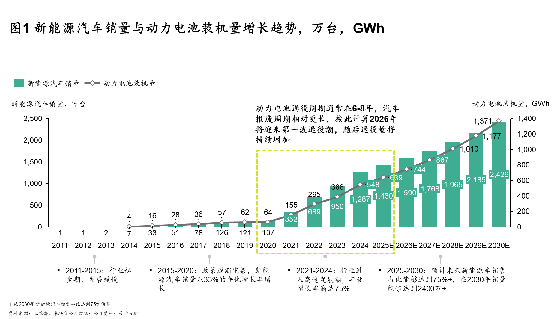 更大的增量还在后面。按照动力电池5至8年的使用寿命推算,2026年至2030年将进入规模化退役高峰期。中国汽车战略与政策研究中心预测,2026年动力电池退役量约43GWh,到2030年将激增至171GWh。经测算,到2030年当年废旧动力电池产生量将超过100万吨,对应市场规模突破千亿元人民币。
