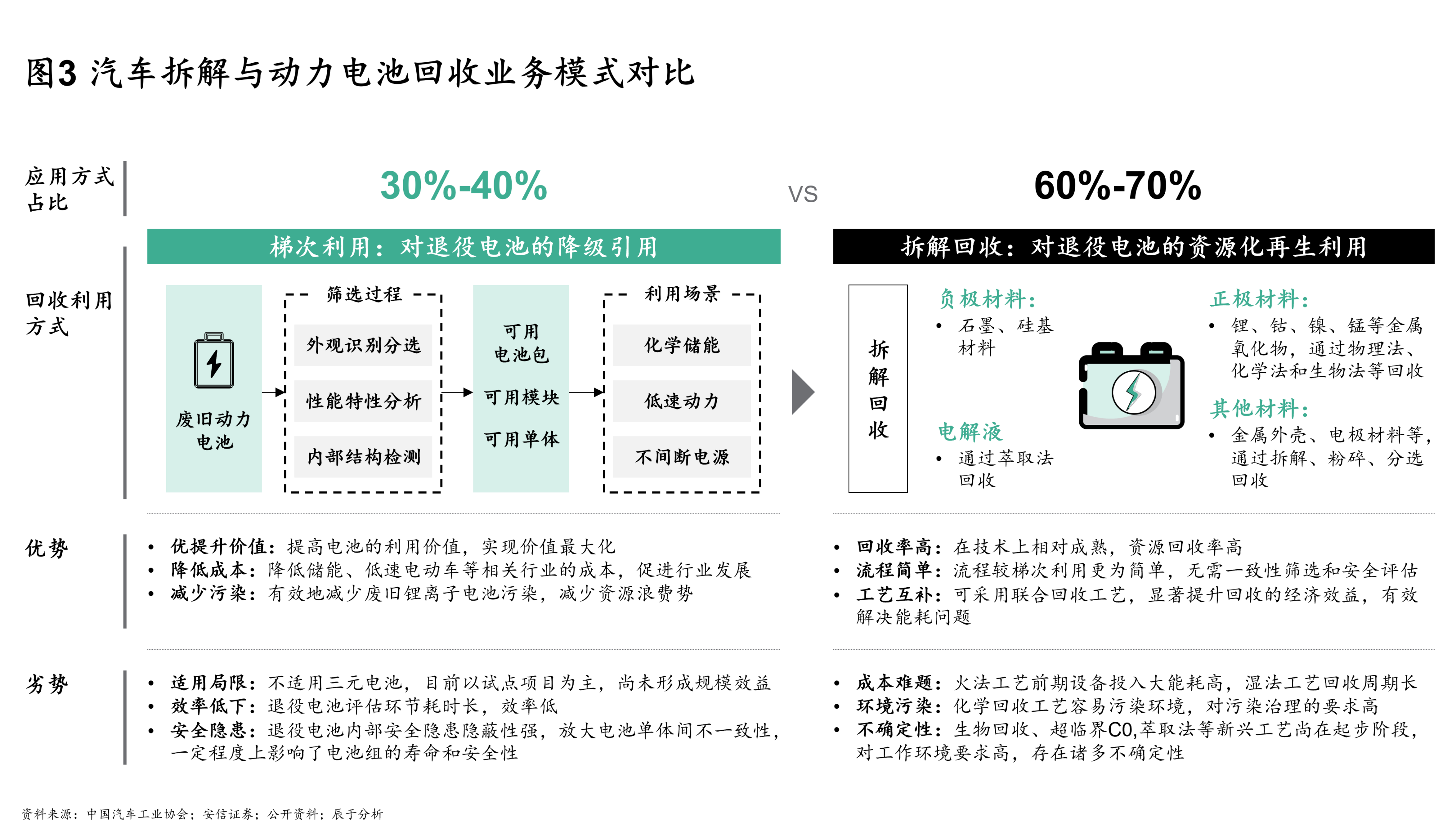 理论上,汽车拆解业务应为电池回收提供天然的第一手电池来源。拆解是回收的前置环节——车辆在完成注销手续后进入拆车厂,电池包在此环节被拆卸,再流入回收利用体系。