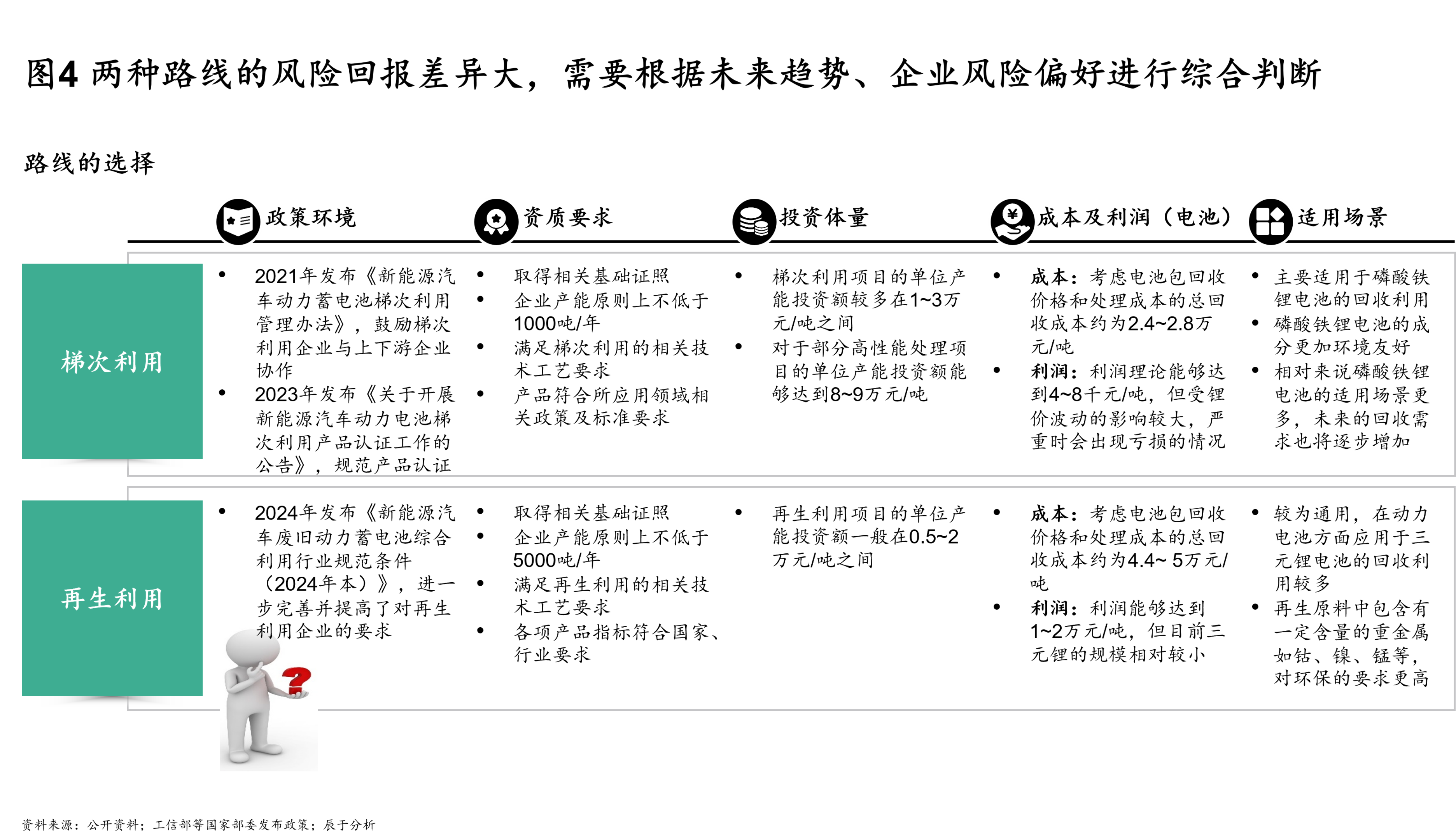 第三,电池回收的方向选择。梯次利用和再生利用的风险收益特征差异巨大。前者投资体量相对较小,但对电池来源和下游应用场景的依赖度高,政策监管也在趋严;后者产能规模要求更大,受金属价格波动影响剧烈。选择哪条路,取决于企业对风险的承受能力和对产业链资源的整合能力(图4)。