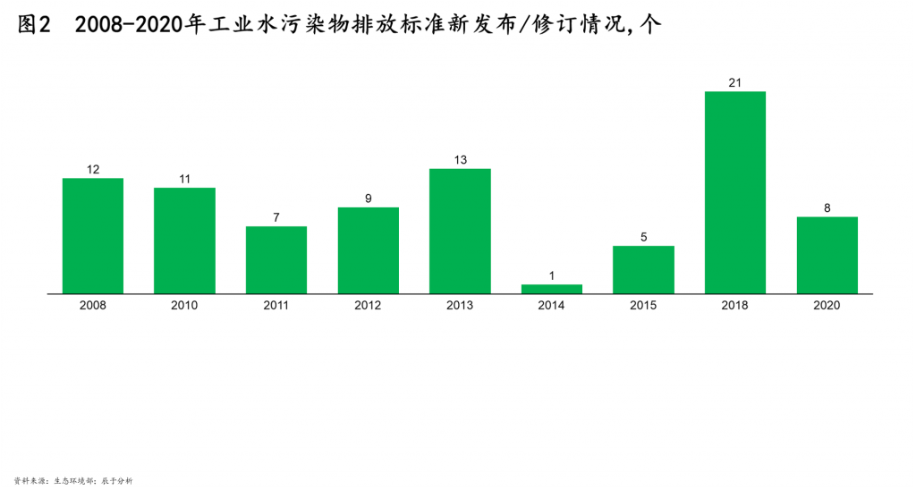 二是排放标准趋严,自行处理难度加大。中央环保督察已完成全覆盖,最新的第二轮、第三批下沉工作任务也已基本完成,8个中央生态环境保护督察组于2021年4月6日至4月9日陆续进驻8个省(区)开展督察。此外,我国自2008年起持续发布及修订了包括造纸、化工等行业在内的水污染物排放标准,不断收紧水污染物排放的限值(如图2)。过去,部分企业内部的废水处理设施处于非正常运行状态,开工率低、处理质量低,不利于达标排放,第三方运营的重要性日渐凸显。