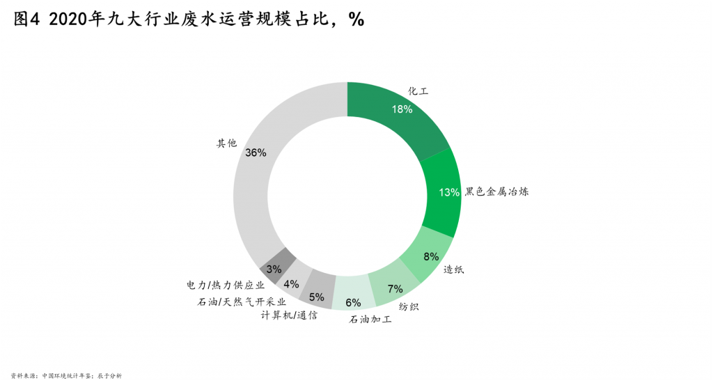 我国工业废水上游行业相当分散,即使是运营规模最大的化工行业,其占比也只有18%(如图4)。