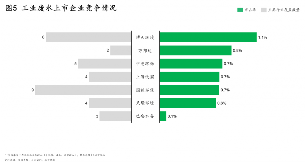 不同行业废水的处理方式大不相同,且存在较高的技术壁垒,工业废水治理企业通常只能专注于某一个或某几个细分领域,导致当前行业竞争格局分散,头部企业市场占有率偏低,“小而散”是主流状态(如图5)。