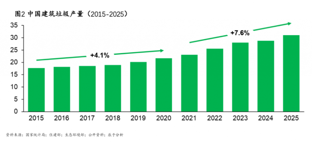 随着城市化进程持续推进,我国新城区建设与老城区改造遍地开花,制造了大量建筑垃圾。一方面,建筑业房屋施工面积过去20年呈指数型增长,2018年达到141亿平方米,产生了大量新建建筑垃圾;另一方面,我国现有建筑面积500亿平方米,其中半数以上寿命小于40年,拆除建筑垃圾空间巨大。经估算,我们预计2020-2025年间建筑垃圾产量将保持7.6%的复合增长直至突破30亿吨(见图2)。