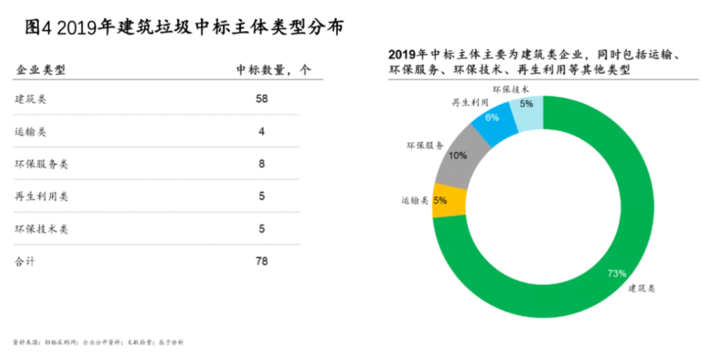 2018年以后,随着相关政策法规爆发式出台,吸引各类企业纷纷入场,建筑垃圾市场参与者变的更加多元(见图4)。目前建筑垃圾市场参与者主要分为两类:一类是以许昌金科为代表的中小型民营企业,以及以柳工为代表的设备制造企业,他们在市场早期就参与其中,手持一定数量的项目,具备一定的运营经验;另一类是新进入者,主要是建筑类企业,也包括环保服务、环保技术、再生利用等其他类型企业,例如光大国际、首创环境等环保服务企业,从一般生活垃圾的处置横向扩张至建筑垃圾领域,由于对该领域相对陌生,上下游价值链也尚未完全打通,仍处在占坑观望的状态;中建等已经进入或中铁建等有意进入的建筑型央企巨头,则手持巨资,本身是建筑垃圾上下游的直接参与者,纵向一体化发展的优势将更加明显。