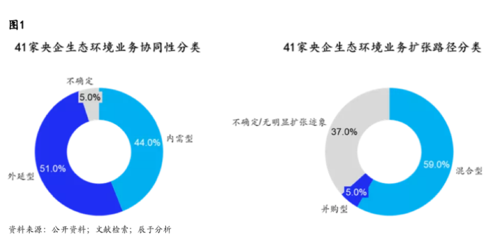 综合来看,除极少数央企完全依靠外延式并购发展,大部分央企发展生态环境业务走了一条内外并举的混合型发展道路(见图2)。