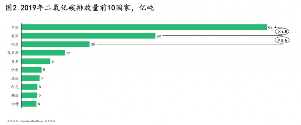 我国于2007年超过美国,成为二氧化碳排放第一大国,2019年二氧化碳排放量94亿吨,远高于同期美国的52亿吨和印度的26亿吨(如图2)。