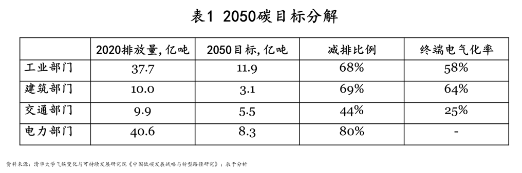 将30·60目标按部门进行分解可以看到,到2050年工业部门需减排68%、终端电气化率58%,建筑部门减排69%、终端电气化率64%,交通部门减排44%、终端电气化率25%,而电力部门则需减排80%以上(见表1)。