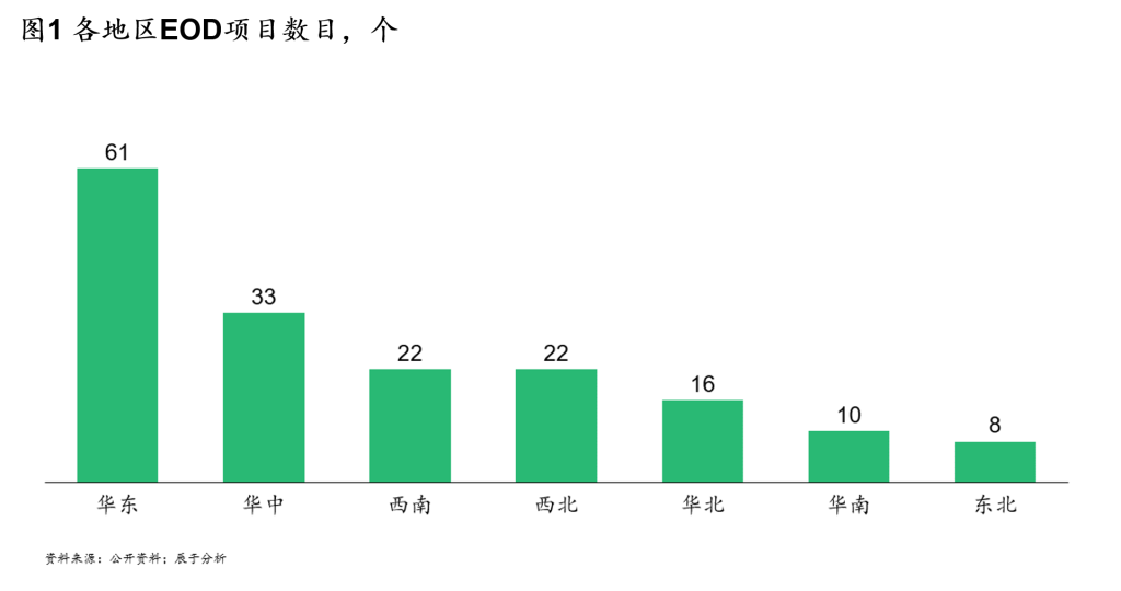 从辰于统计的172个项目来看,目前EOD项目数量最多的地区是华东地区,项目数量为61个,占比高达35%;其次是华中地区,项目数量为33个,占比为19%;项目数量最低的区域是东北地区,仅为8个,占比5%(见图1)。