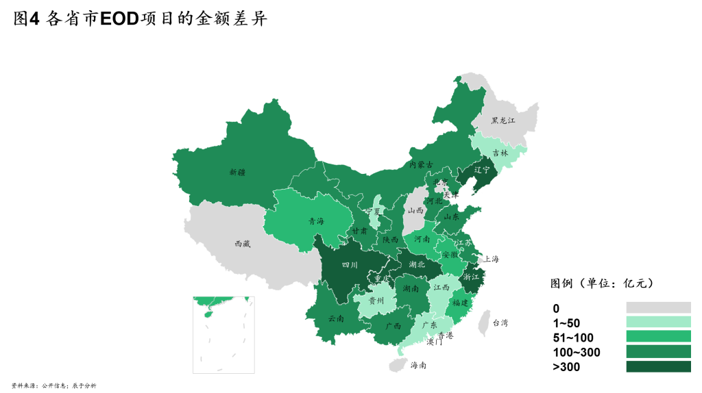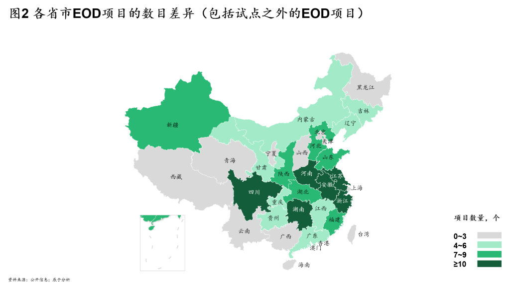 如果只从两批试点看,除了少数几个省份外,大部分省份都参与了EOD试点,看不到省份之间的太大差别。但如果将试点之外的项目也纳入统计,就能发现各省的不均衡(见图2)。