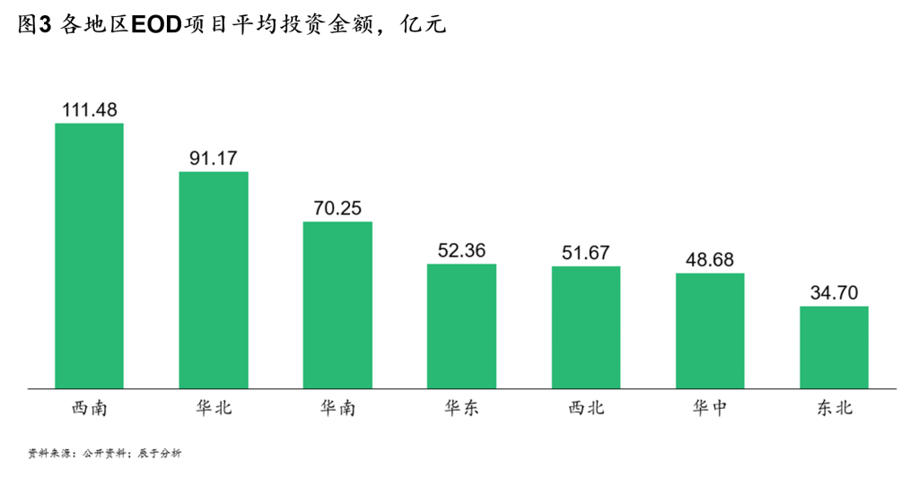 从已公布金额的项目来看,现有EOD项目平均金额(项目总金额,部分项目算入了项目带动的二次投资金额)为64.6亿元,其中平均投资金额最高的区域为西南,达到111.5亿元,平均投资金额最低的区域为东北,为34.7亿元。