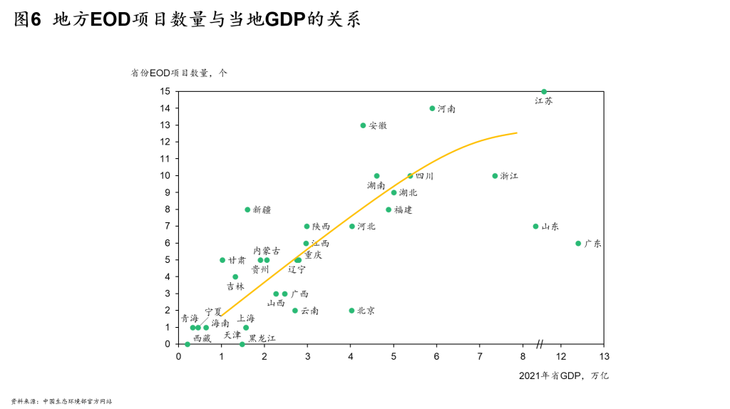 通过对比分析各省市现有EOD的项目数量和当地GDP的关系,我们发现事实确实如此,一个省的GDP和该省EOD项目实施数量呈较为明显的正比例关系,也就是说经济越发达、越市场化的地区开展的EOD项目数量越多(见图6)。