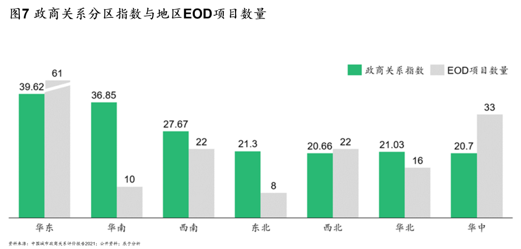 确实,华东地区各省市在政企关系上综合来说做的更好,塑造了良好的市场化环境,积累了不少政企合作的宝贵经验,这对于以社会资本驱动的EOD模式的推动与落地无疑是良好的基础。