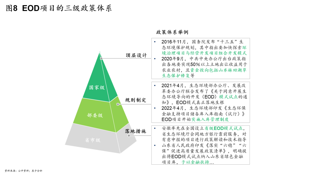 目前EOD相关政策基本上形成了国家级-部委级-省市级三级政策体系,地方政府发布的地方政策更适合当地的实际情况,对于各个市县来说更加有影响力,地方政府在EOD项目的推动过程中起着关键作用(见图8)。