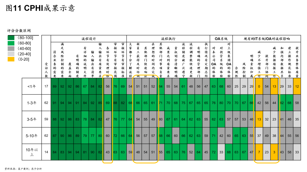 管理是一门艺术,流程是一门哲学,从时间到运营,从业务到数据,从战略到组织,流程穿插其中,包罗万象的流程是讨论不尽的,而从这些复杂的管理概念出发得出的对先进流程的畅想始终会显得过于主观,不易实操。为了能够对企业的流程体系做出客观、全面的评价,辰于从更务实的一条路径出发,融合上述先进流程的探讨,开发了CPHI(Chenyu Procedure Health Index)——辰于流程健康指数测评工具,以对企业的流程体系进行全面的体检诊断。被诊断企业不仅可以了解自身在流程工作方面的现状与问题,还可以与其他绿色环保企业进行横向对比,找到自身在行业中的相对位置及差距(见图11)。