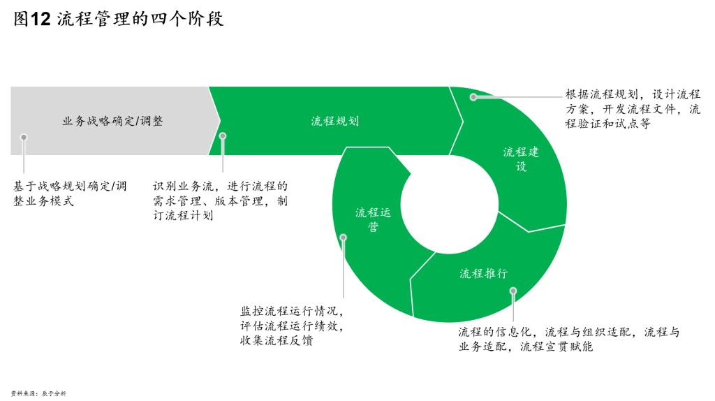 流程管理的全生命周期包括四个阶段:流程规划、流程建设、流程推行、流程运营(见图12)。通过流程规划,确定流程开发的方向、计划、需求;通过流程建设,形成可行的流程方案以及相应的支持性文件、标准;通过流程推行,将流程在整个组织中贯彻下去,并将流程集成到信息系统;通过流程运营,发现流程存在的问题,作为下一步规划中考虑的内容。