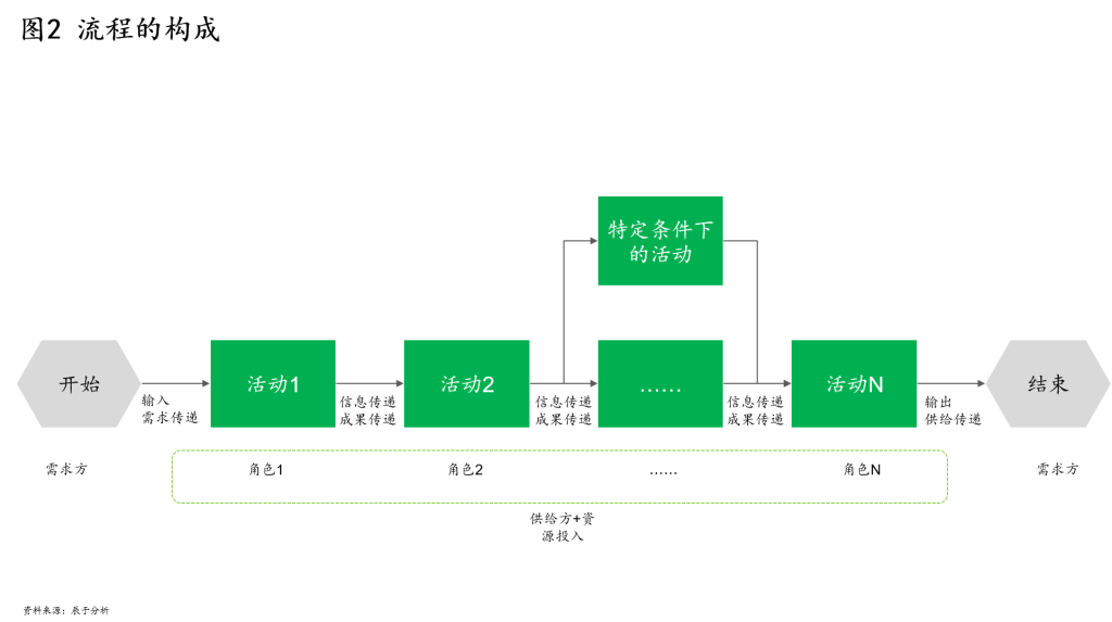 在流程与时间的这层关系下,一切围绕时间在转的事物,都将被流程所包含。从具体构成来看,流程通常包含这样七个要素:需求方、需求(输入)、为满足需求开展的活动、为开展活动投入的资源、活动间的关系、供给方、供给(输出)(见图 2)。