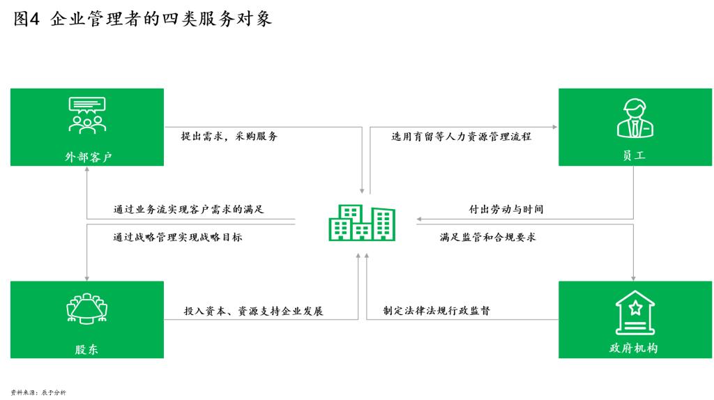 而广义概念下,不只是企业的外部客户叫做客户,企业实际上共有四类服务对象:让客户满意,让员工满意,让股东满意,让政府满意,每一类对象都事关企业的生存与发展(见图4)。针对每一类服务对象,企业都会有流程来应对,或者通过质量要求、安全要求、时效要求的形式把这些需求放在流程中。